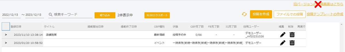 2023年12月13日にバージョン1.28.0のリリースを実施いたしました。 【投稿】 旧バージョンの投稿履歴画面を廃止して、 新バージョンの投稿履歴画面に移管いたしました。 ▼「旧バージョンの投稿画...