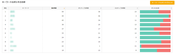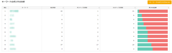 - それぞれの項目で、昇順/降順を切り替えて見れます(例:ポジティブ比率の高いキーワードランキングが見たい、等が可能)